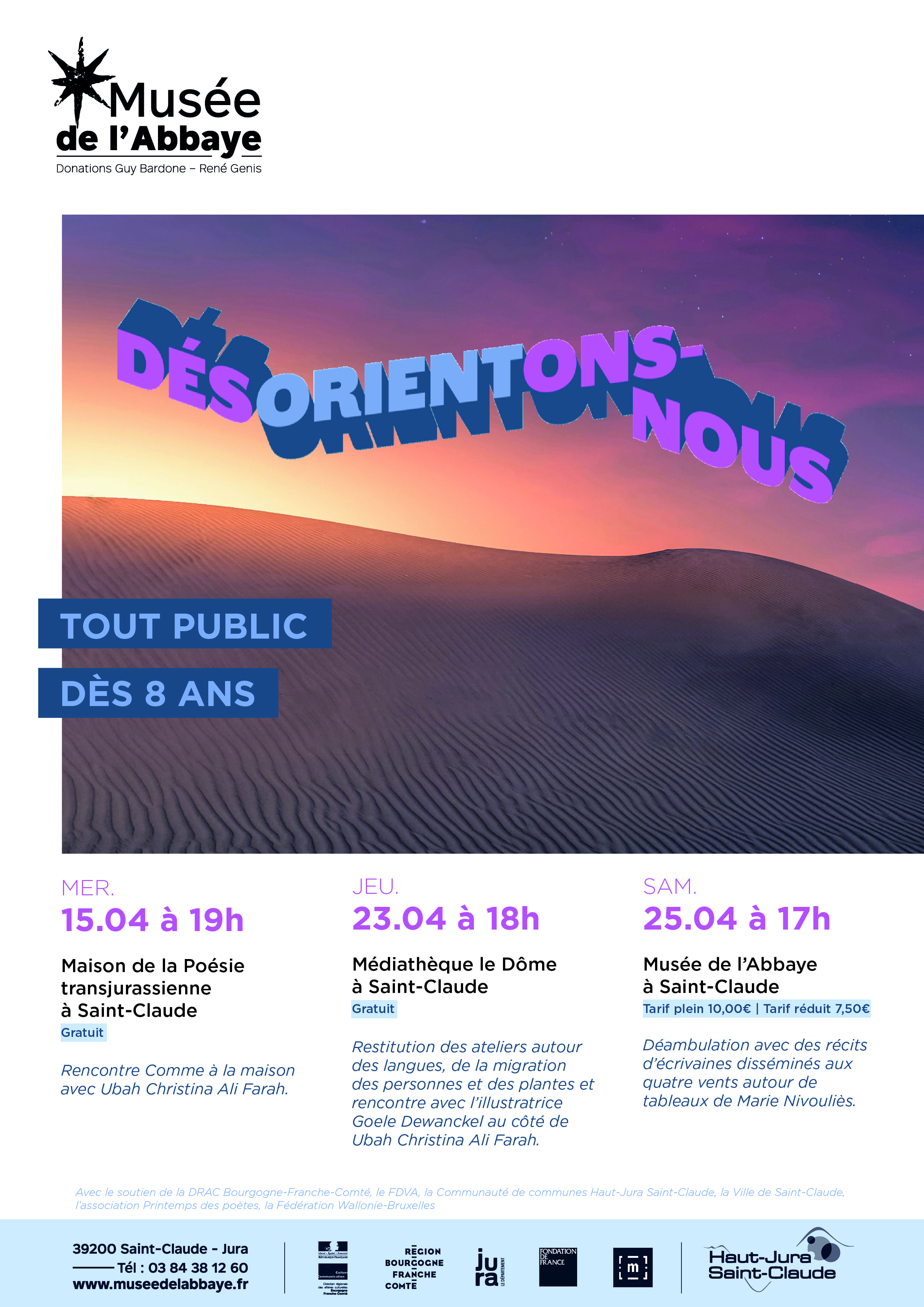Ubah Cristina Ali Farah est accueillie deux semaines en résidence à la Maison de la poésie transjurassienne en partenariat avec la médiathèque et le musée de l'Abbaye de Saint-Claude (Jura).